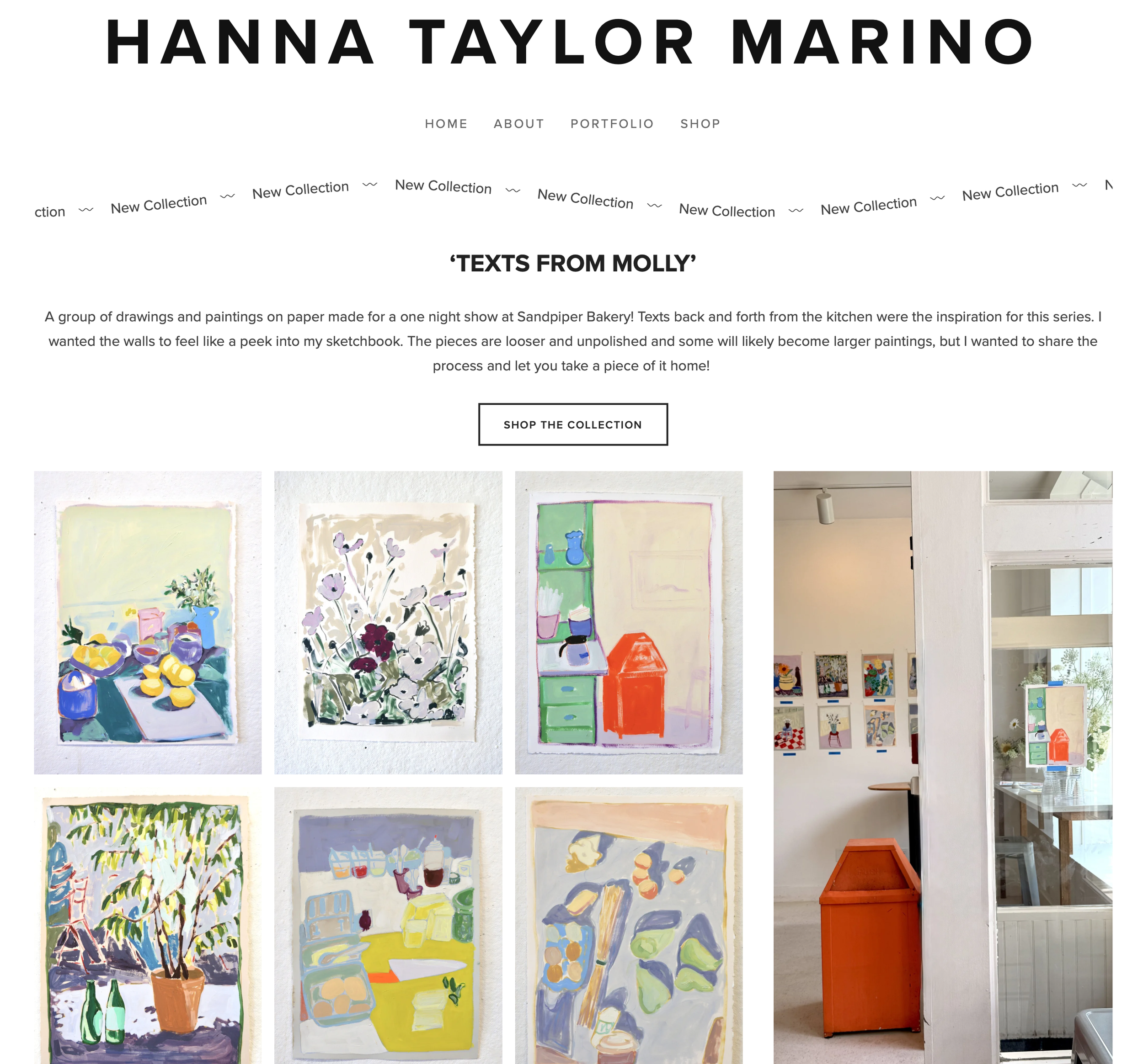 Painter Hanna Taylor Marino drew inspiration from everyday moments at local favorite Sandpiper Bakery to create her “Texts From Molly” collection. The series highlights spaces, nooks, treats, and in-between moments—sent to her by bakery owner Molly—that give the bakery its undeniable charm. I photographed the collection for her website launch, managed updates to the online shop and portfolio, and created pre-launch social content to highlight both the artistry and playful spirit of the work. To celebrate the launch, Hanna and Molly hosted a pre-launch, gallery-style wine night at the bakery and enlisted me to transform the space from daytime café to evening wine bar. I designed menus and signage, created social content, photographed the event, and supported production throughout the evening, resulting in a seamless and memorable night for both clients and their guests.
